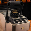 Cortado Club pairs a Palladium Metallic finish with tan Uberkaro plaid automotive upholstery panels to create a configuration that feels like stepping into a well tailored interior where craftsmanship and familiarity meet. The genuine automotive grade fabric introduces structure and texture across the front of the machine, and because the material is real, each panel carries subtle variation that reinforces its authenticity. Under the Line1 downlighting, the pattern reveals depth without overwhelming the calm metallic exterior. A complementary emblem completes the composition with a refined accent that ties the palette together. Built with a stainless steel brew path and designed for Nespresso OriginalLine compatible capsules, it combines everyday convenience with materials chosen for durability and consistency. The result is a welcoming, character rich configuration that fits naturally into kitchens and spaces where comfort and heritage materials shape the daily ritual.