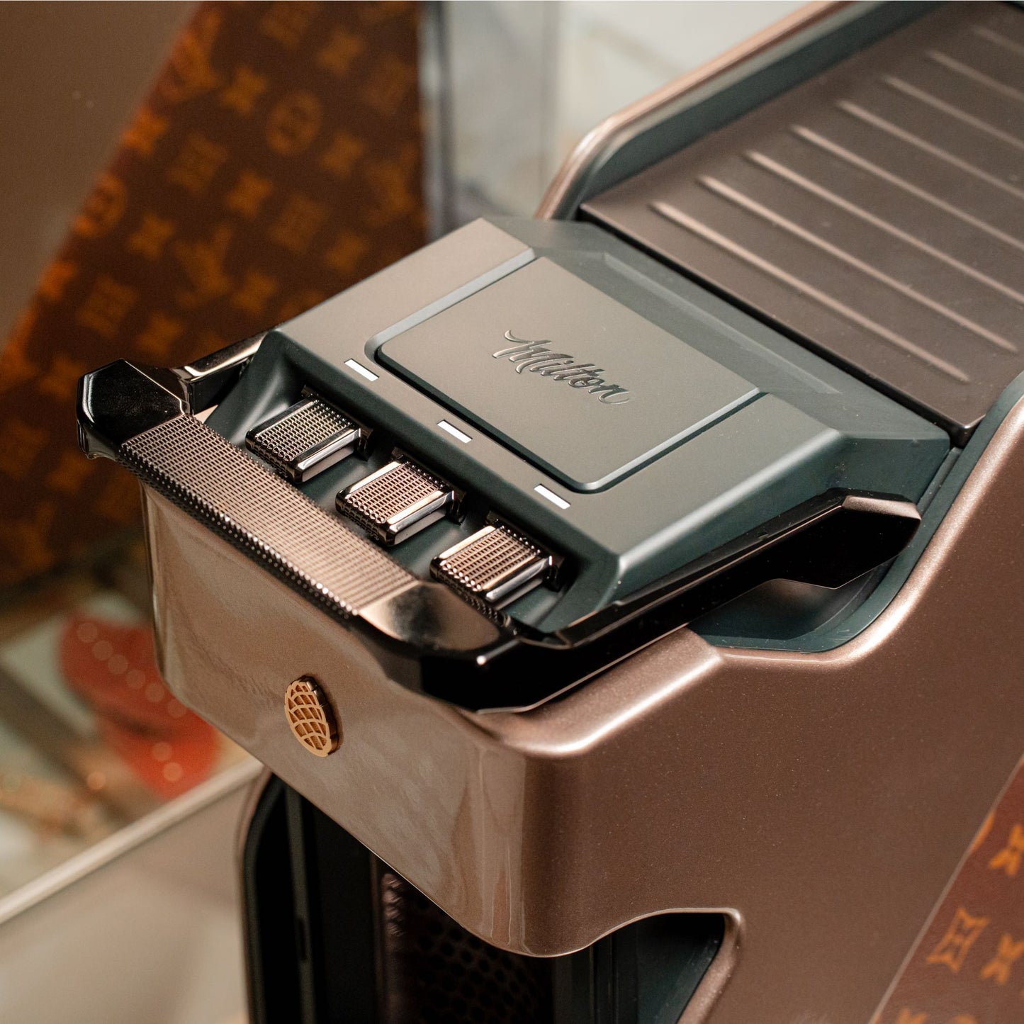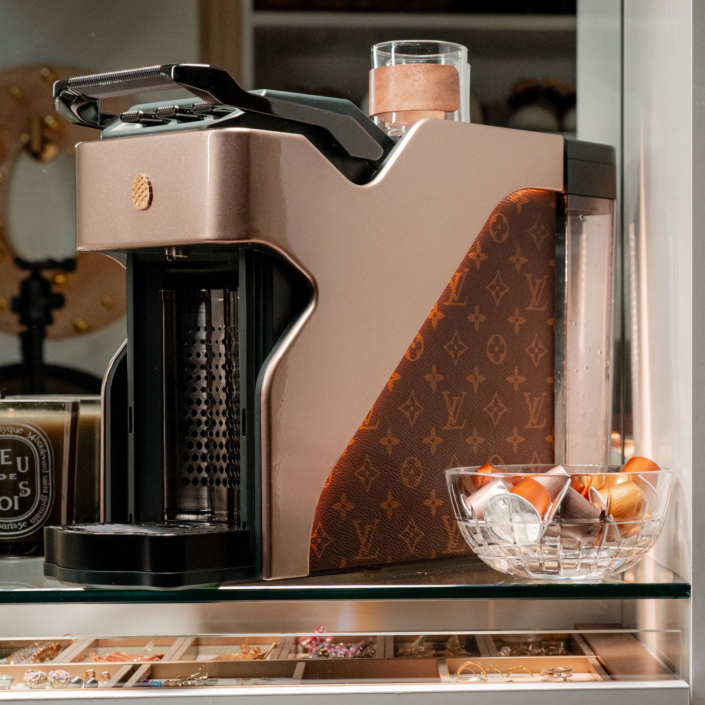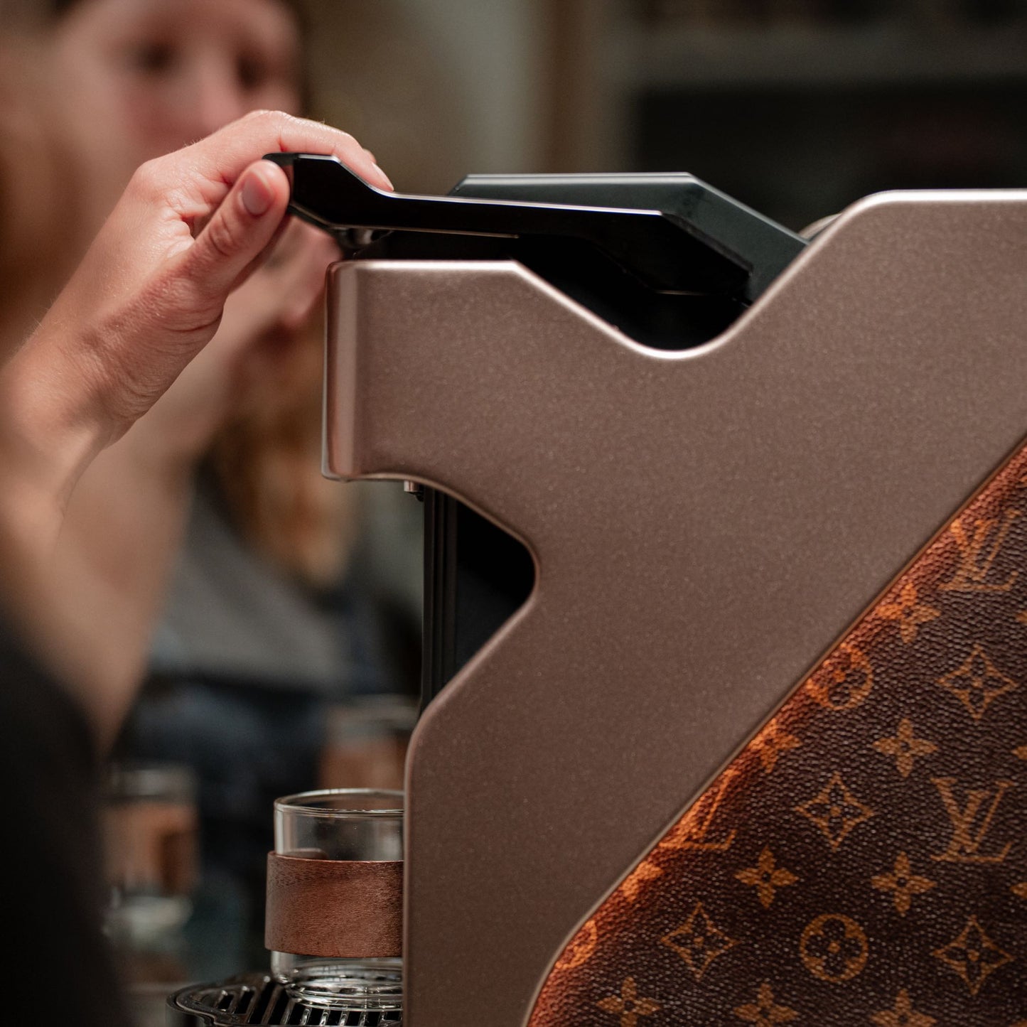 Palladium Metallic and genuine upcycled Louis Vuitton leather come together in a Line1 edition built for fashion enthusiasts and design collectors. The metallic finish has a soft, editorial sheen, while the LV panel introduces a layer of texture and heritage that transforms the machine into a statement piece. Accented with a gold emblem, it is the kind of configuration that looks perfectly at home next to designer books, art objects, and the well curated spaces of someone who knows their fashion houses by heart.